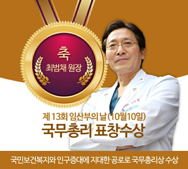 2018년 10월 10일, 서울 영등포구 KBS 아트홀에서 열릴 예정인 “임산부의 날” 행사에서 시엘병원 최범채 병원장이 국민보건복지와 인구증대에 기여한 공로를 인정받아 국무총리 표창을 받게 되었습니다. 최범채 원장은 국내 난임환자 시술건수 12,400여건, 외래환자 10만여 건을 진료하여 임산부의 건강관리와 건강한 아기의 출산에 이바지해 왔습니다. 이번 수상으로 난임 극복을 통한 인구증가와 선도 기술 개발에 대한 최범채 원장의 노력이 결실을 맺었다고 할 수 있습니다. 앞으로도 난임 극복과 국민보건복지 증진을 위해 항상 최선을 다해 노력하는 시엘병원이 되겠습니다. 감사합니다.