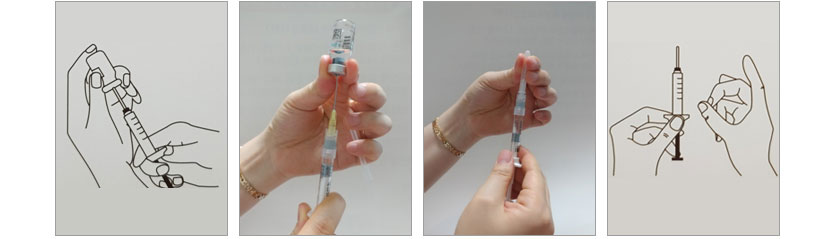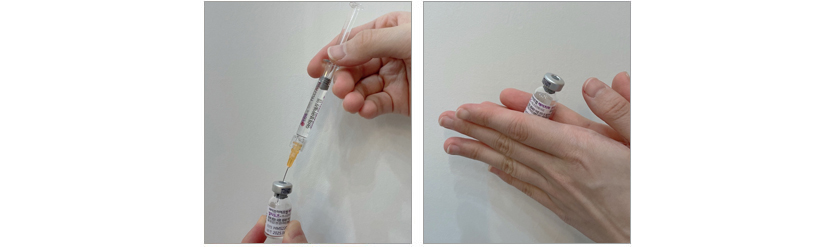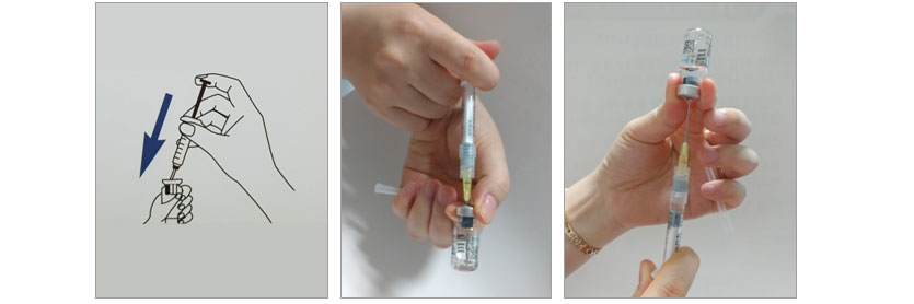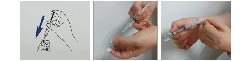 • 약병에서 잘 녹은 주사액을 다시 주사기에 담습니다.