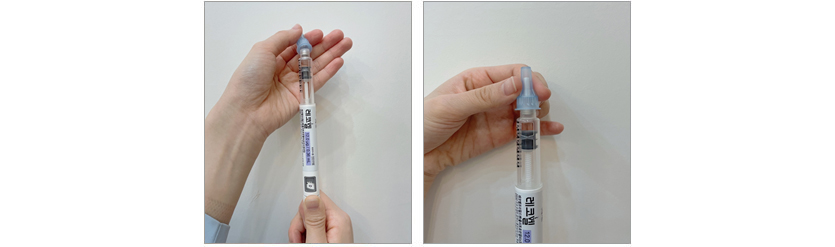 • 주사기에 주사약이 다 담겨진 후, 수직으로 세워서 공기를 위로 올라가게 한 다음 피스톤을 살짝 누르면서 공기를 빼줍니다.