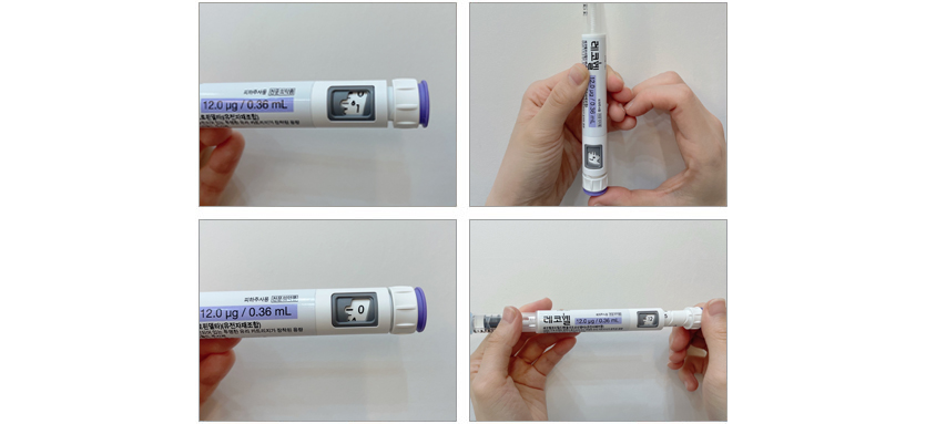 b. 주사할 부위를 가볍게 잡고 펜을 90도 각도로 세워 주사침을 피부에 완전히 꽂은 후, 용량 표시창의 숫자가 "0"으로 바뀔 때까지 다이얼을 눌러 주사한다.