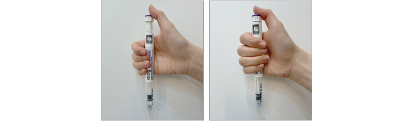 • 주사침을 주사부위와 수직으로 만나도록 주사침을 끝까지 주사부위로 다 넣은 후, 주사기 피스톤을 누르면서 주사약을 서서히 넣습니다.