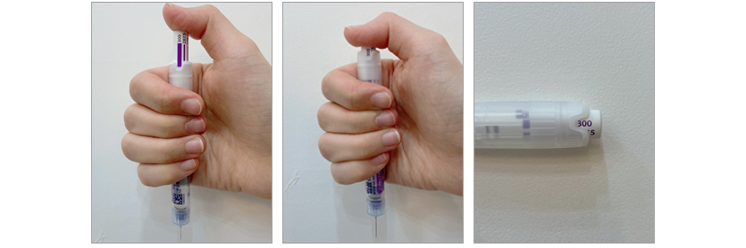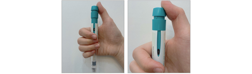 주사침을 위로 향하도록 프리필드 펜을 잡고, 내부 마개를 조심스럽게 빼서 버린다.