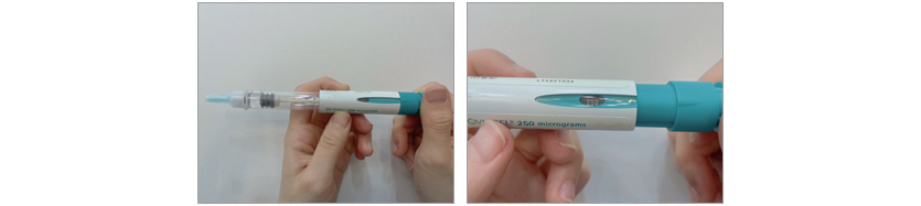 - 나삿니가 있는 프리필드 펜의 끝부분을 주사침 외부 마개 안쪽으로 밀어 넣고 가벼운 저항감이 느껴질 때까지 조인다.