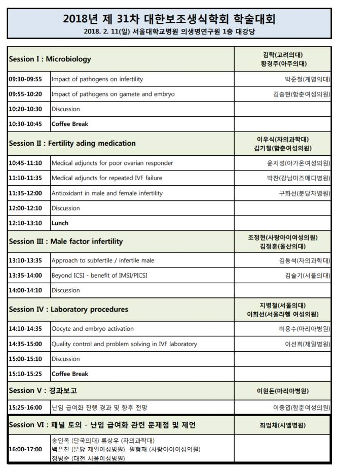 | 2018. 2.11. KOSAR 학술대회, 최범채 시엘병원장, 난임 급여화 관련 패널토의 좌장으로 진행 | |