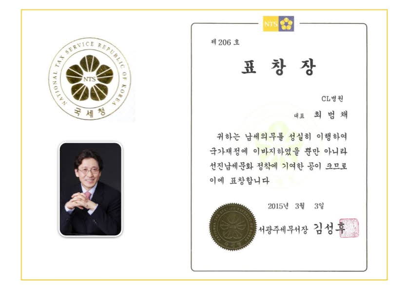 2015년3월3일 시엘병원 최범채 원장님이 납세의무를 성실히 이행하여 표창을 받았습니다 |