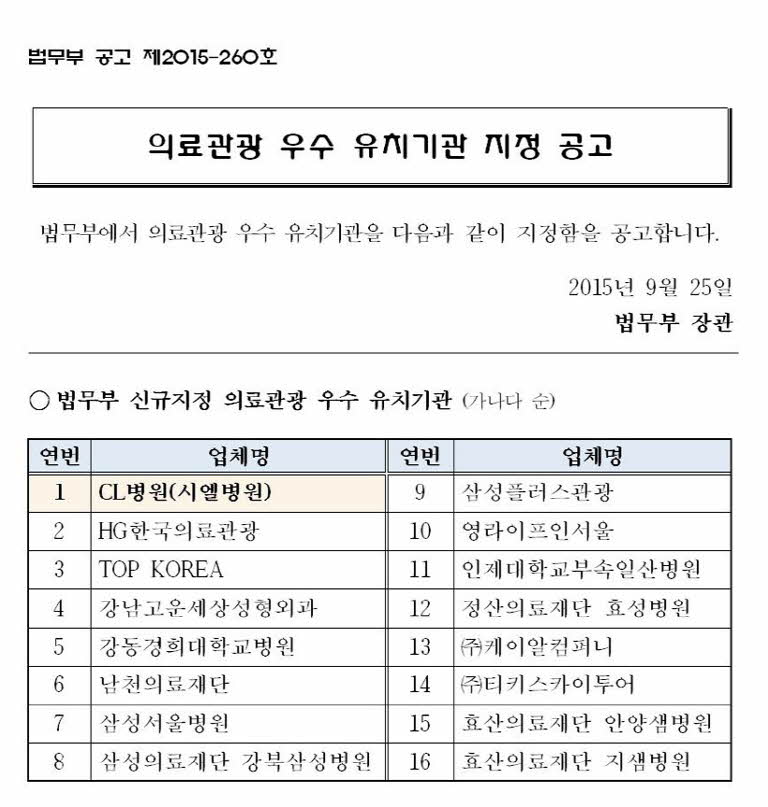 | 2015년 의료관광 우수 유치기관 선정을 축하합니다 | |