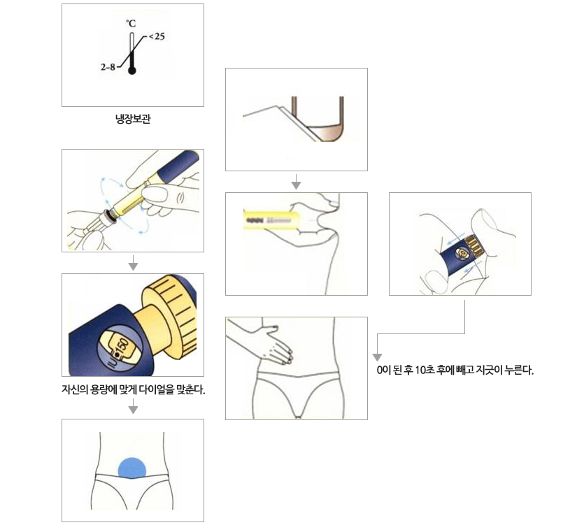 처방받은 1회 용량만큼 빼고 바이알에 남은 약은 다음에 사용해야 하므로 깨끗이 냉장 보관한다.