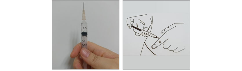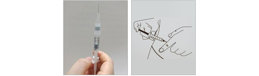• 주사침을 주사부위와 수직으로 만나도록 주사침을 끝까지 주사부위로 다 넣은 후, 주사기 피스톤을 누르면서 주사약을 서서히 넣습니다.