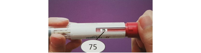 1) 자신의 1회 투여량에 맞추어 표시창에 투여량 표시가 나타날때까지 돌려서 맞춥니다. 예를 들어 자신의 1회 투여량이 75라면 사진에서처럼 빨간색 손잡이를 돌려서 숫자 75에 맞춥니다. 만약 150이라면 150에 맞추고, 225라면 225에, 300이라면 300까지 돌려서 표시창에 숫자를 맞춥니다. 개인별로 자신의 용량이 다르니 주의깊게 자신의 용량에 잘 맞춥니다.