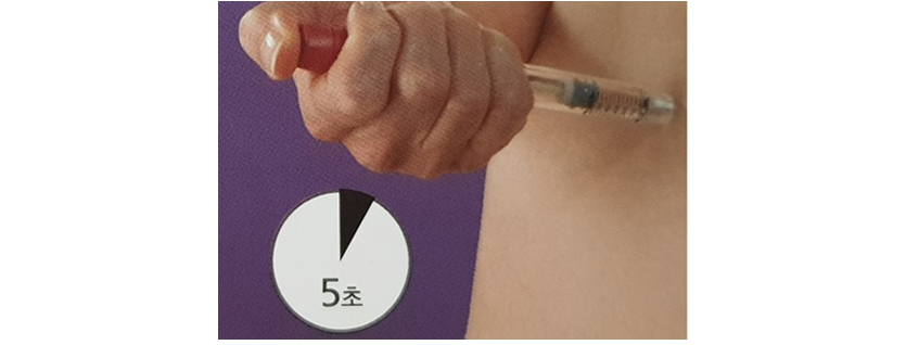c. 다이얼을 누른 상태로 적어도 5초간 유지하여 주사가 완료되도록 한 후 피부에서 주사침을 빼낸다.