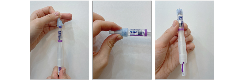 주사침을 위로 향하도록 프리필드 펜을 잡고, 내부 마개를 조심스럽게 빼서 버린다.